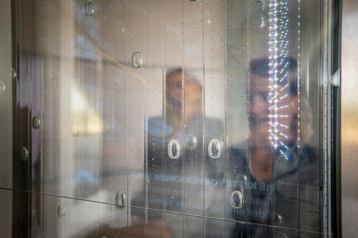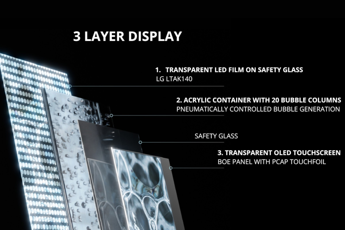 Die Acrylglaselemente sind mit pneumatischen Ventilen ausgestattet, die Luftblasen im Glycerin erzeugen und so einfache Formen oder Buchstaben abbilden können. Die LED-Folie projiziert bei Aktivierung Farben und Informationen auf die Blasen, bleibt im Ruhezustand jedoch durchsichtig. Über den Multitouch-Screen als oberste Schicht können Besucher die Installation interaktiv steuern.