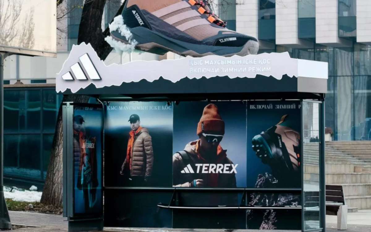 Im urbanen Almaty verwandelte Adidas Verkehrshaltestellen in aufmerksamkeitsstarke Touchpoints mit überdimensionalen Terrex-Wanderschuhen. Die OoH-Installationen schlagen eine Brücke zwischen Stadtleben und Natur. Das Herzstück der Kampagne liegt jedoch weit außerhalb der Stadt.