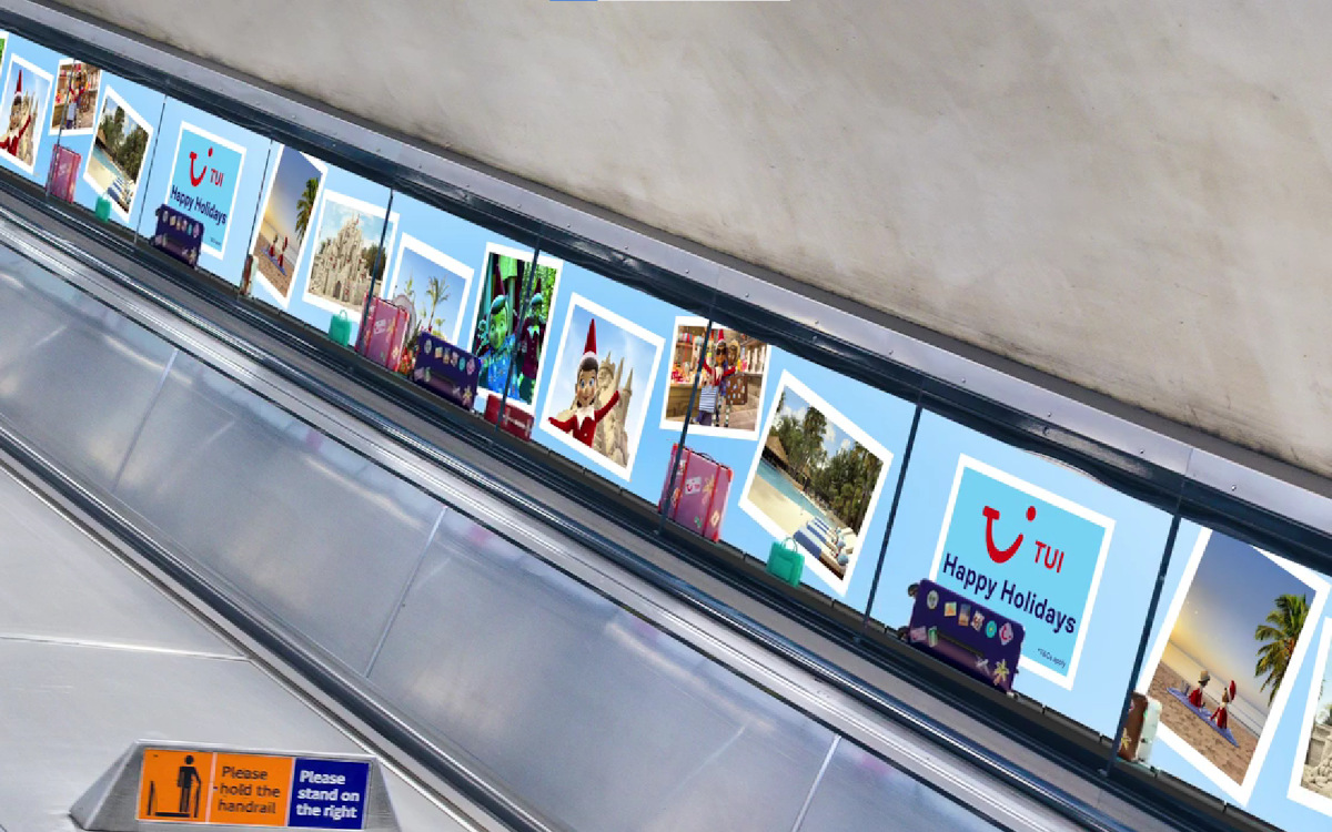 Im London Underground nutzte Reiseveranstalter Tui vernetzte Rolltreppen-Screens. An den Stationen Kings Cross, Oxford Circus und Waterloo liefen zehn Sekunden lange Animationen mit 3D-Effekt auf den sogenannten digitalen Ribbons. Die Motive zeigten animierte Figuren aus dem TV-Spot, die sich sequenziell über mehrere Screens bewegten und entlang eines visualisierten Gepäckbands inszeniert wurden. Produktion und Animation übernahm POD LDN in Zusammenarbeit mit Global. Die Kampagne lief vom 5. bis 18. Dezember 2025.