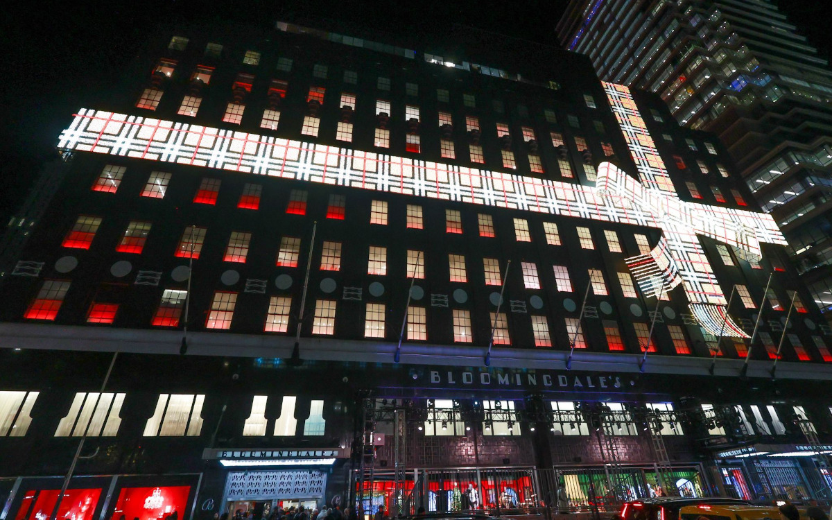 In New York realisierten Burberry und Bloomingdale’s eine Fassadeninstallation am Flagship-Store in der 59th Street. Die beleuchtete Gebäudehülle zeigte ein grafisches Muster auf Basis des Burberry-Checks. Bestandteil der Umsetzung waren zudem Schaufensterinstallationen und eine großformatige, beleuchtete Schalstruktur. Die Installation ist bis zum 5. Januar 2026 zu sehen.