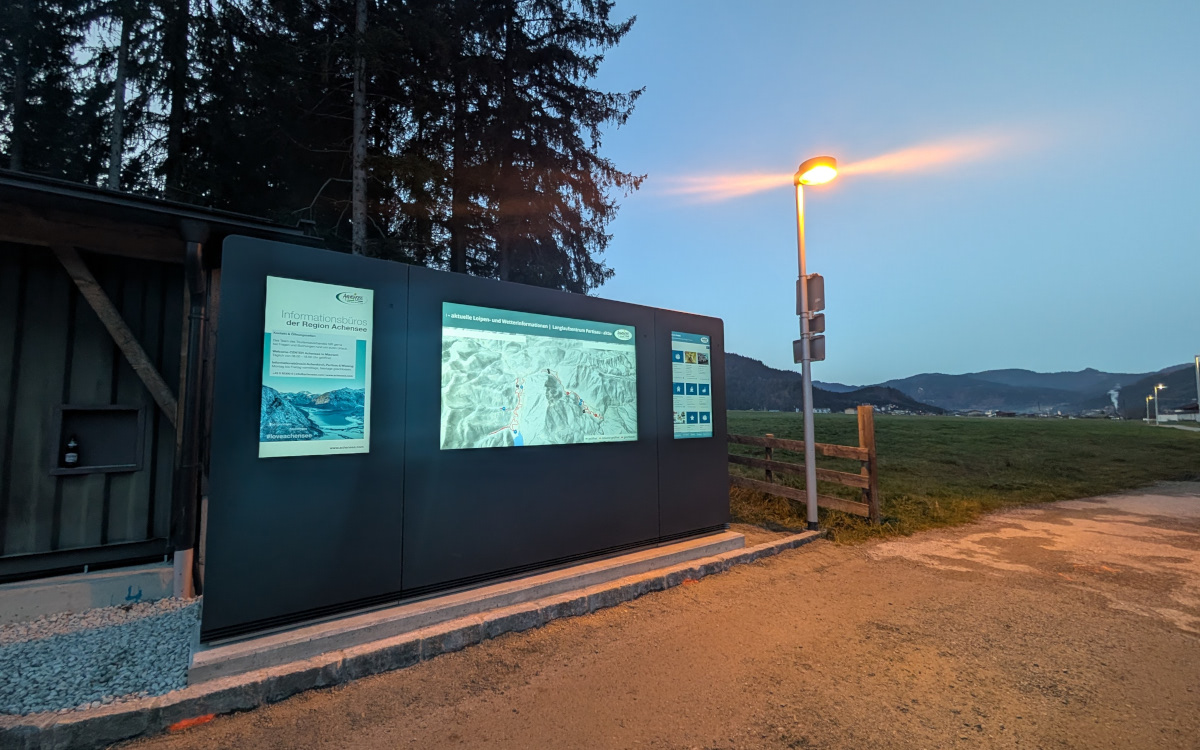 Inhaltlich bietet das Dreifachsystem dem Tourismusverband maximale Flexibilität. Der Status von Wanderwegen und Langlaufloipen lässt sich in Echtzeit aktualisieren, Routen können direkt am Touchdisplay erkundet werden. Ergänzt wird das Angebot durch aktuelle touristische Informationen aus der Region. Zusätzlich erhalten lokale Unternehmen die Möglichkeit, ihre Angebote auf den DooH-Flächen zu präsentieren – die Vermarktung übernimmt der Tourismusverband Achensee selbst.