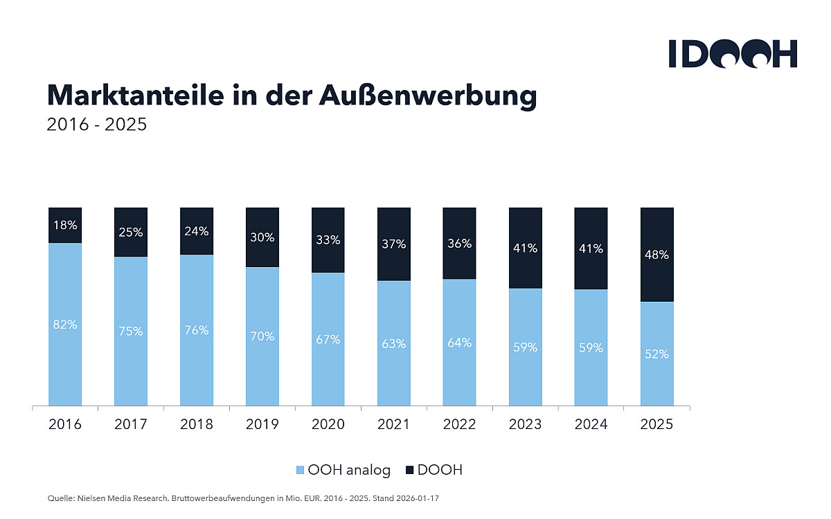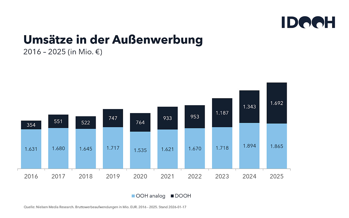 Der Nielsen Werbetrend für das vergangene Jahr 2025 weist DooH wieder als den großen Wachstumsgewinner aus: Die digitale Außenwerbung konnte ein Plus von 26 Prozent gegenüber dem Vorjahr verzeichnen. Damit wächst der jährliche Brutto-Werbeumsatz von DooH um rund 350 Mio. Euro auf circa 1,7 Mrd. Euro – und das, obwohl der Werbemarkt insgesamt mit 0,9 Prozent Rückgang beziffert wurde.