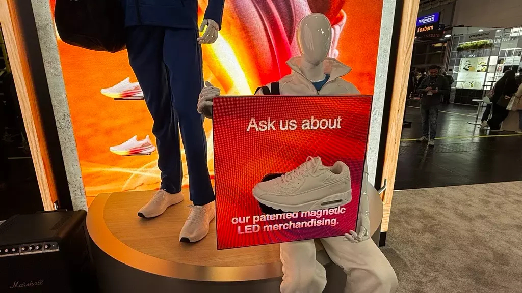 Ein Höhepunkt bei Outform auf der Euroshop ist ein Projekt für eine globale Sportartikelmarke: ein flexibles LED‑Retail‑Display‑System mit magnetischen Schuhablagen. Statt fester Lochraster oder vorgegebener Regalstrukturen ermöglichen die magnetischen Halter, Produkte an jeder beliebigen Stelle auf der LED‑Fläche zu platzieren.