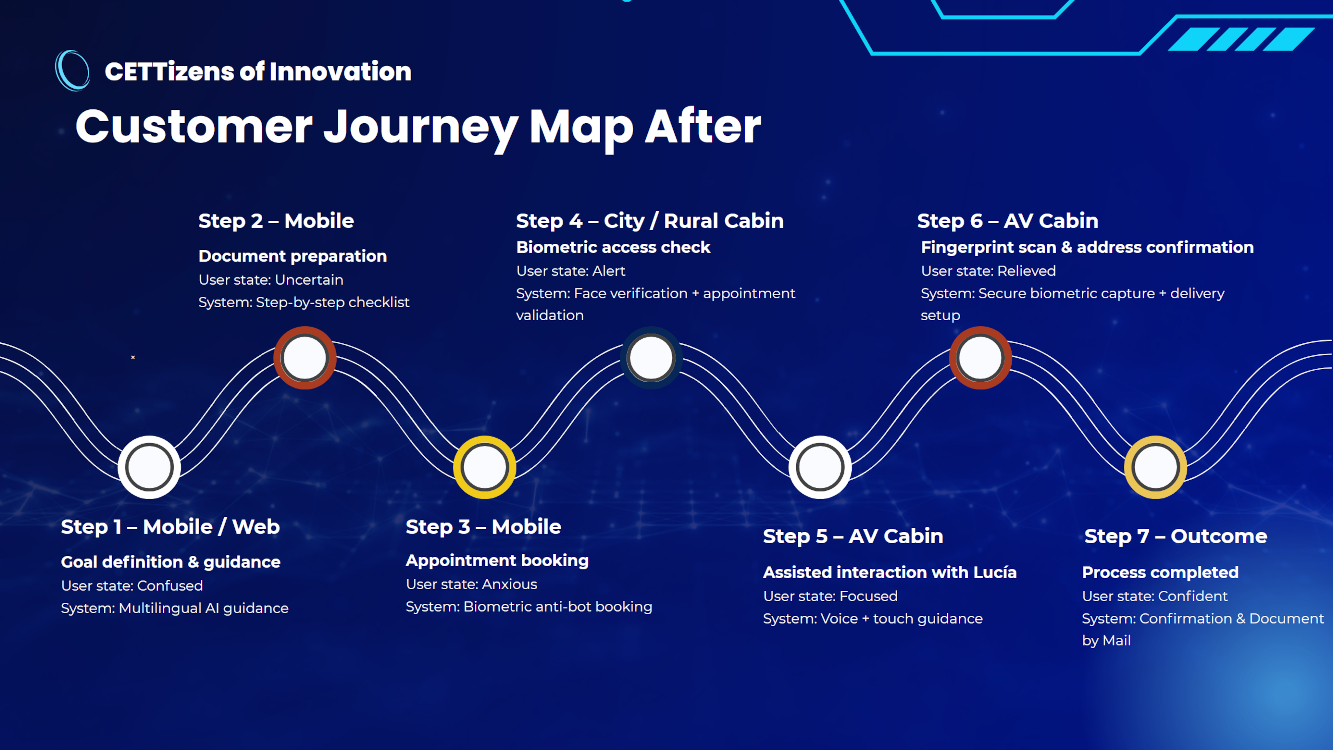 Das Siegerprojekt Lucia wurde von den „Cettizens of Innovation“ entwickelt – einem Team der UB CETT Barcelona School of Tourism, Hospitality and Gastronomy. Die Studenten widmeten sich einem hochrelevanten Problem für Nicht-EU-Bürger in Spanien: dem komplexen jährlichen Prozess zur Beantragung und Erneuerung der Aufenthaltserlaubnis. Dieser erfordert derzeit mehrere Behördengänge, während Termine oft nur auf dem Schwarzmarkt für 50 bis 500 Euro ergattert werden können.