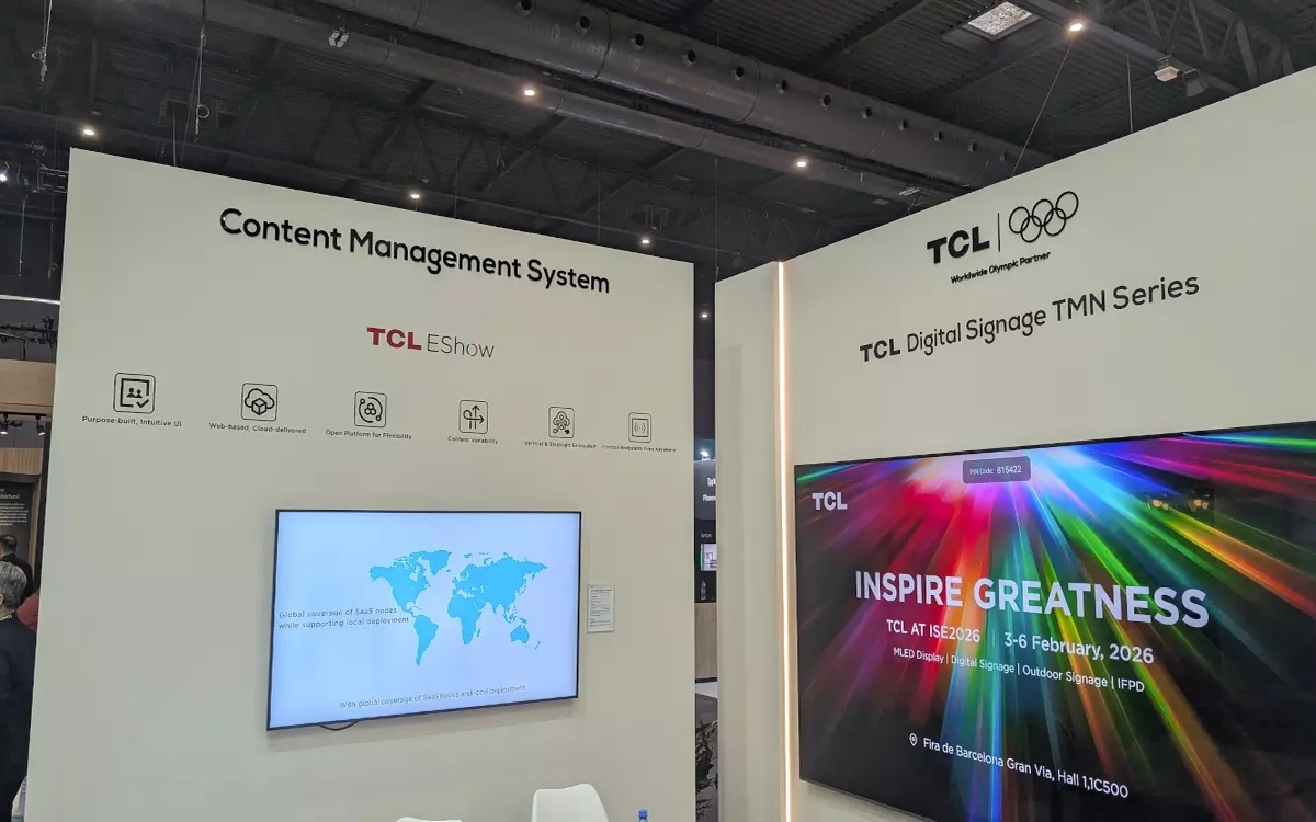 TCL präsentierte wohl das umfassendste Display-Portfolio auf der ISE 2026, das von klassischen Digital-Signage-Screens über exotische großformatige Kunst-Displays und hocheffiziente High-Brightness-LCDs bis hin zu MicroLED-Innovationen mit weltweit führender Kontrastleistung reichte.