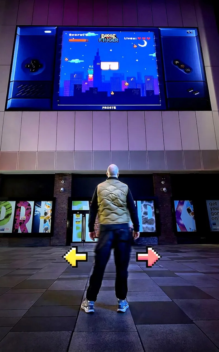 Der fliehende Hintern wird dabei über die Skeletterkennung in den Screens von Ocean Outdoor tatsächlich über die echten Gesäßbewegungen der Teilnehmer gesteuert.