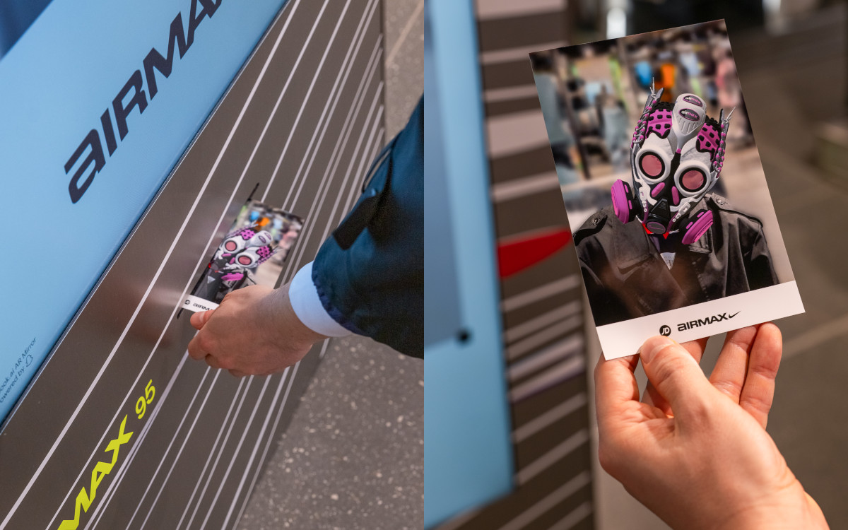 Beeinflusst von Sneaker-basierten Maskenkonzepten der Kreativ-Community Bubble Koppe übersetzt die Installation Schuhdesign-Elemente in tragbare digitale Visuals. Der Store installierte Smart Mirror verwandelt das Spiegelbild der Besucher in Echtzeit und ermöglicht es ihnen, die AR-Masken, die der Ästhetik von Nike-Sneakern nachempfunden sind, virtuell anzuprobieren – und das Ergebnis vor Ort auszudrucken.