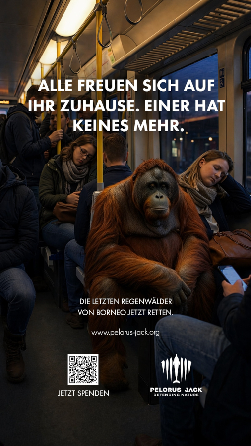 Das Motiv zeigt einen Orang Utan als Pendler. Die Botschaft: Während sich die anderen Fahrgäste auf ihr Zuhause freuen, hat die bedrohte Affenart keines mehr. Ein Call-to-Action mitsamt QR-Code zur Spenden-Website macht die Anzeige komplett.